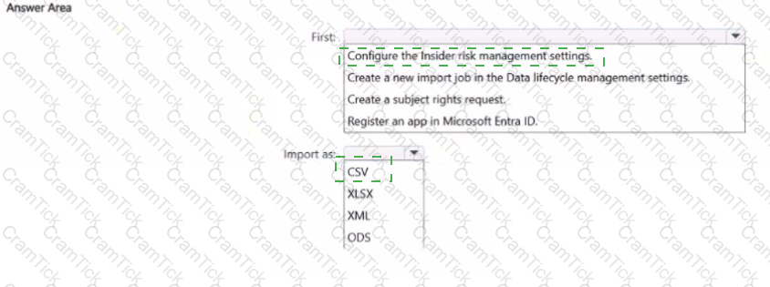 What should you do first and in which format should you import the data? To answer, select the appropriate options in the answer area.