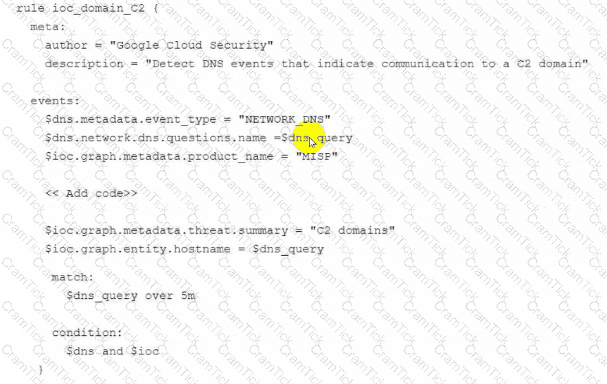 You are implementing Google Security Operations (SecOps) for your organization. Your organization has their own threat intelligence feed that has been ingested to Google SecOps by using a native integration with a Malware Information Sharing Platform (MISP). You are working on the following detection rule to leverage the command and control (C2) indicators that were ingested into the entity graph.